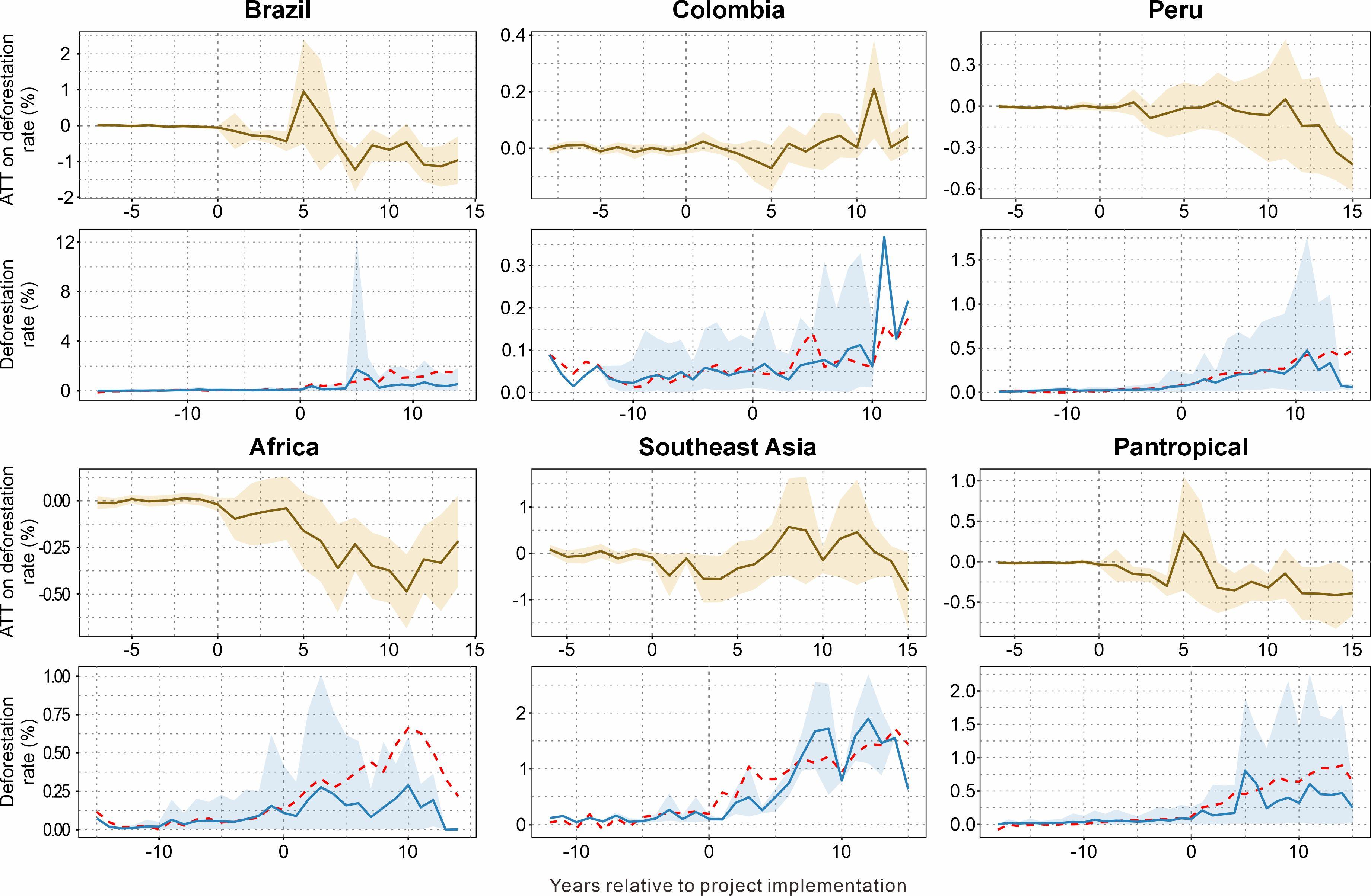 图4 REDD+项目对巴西、哥伦比亚、秘鲁、非洲、东南亚和整个泛热带地区毁林率的平均影响