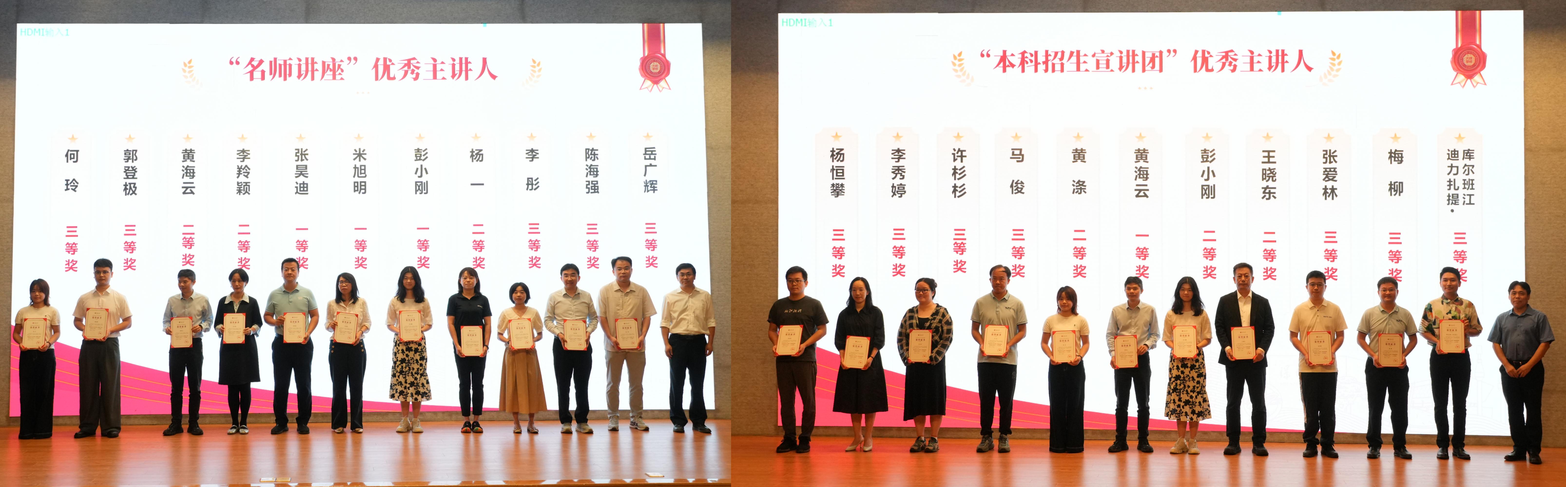 会上,毛军发与学院签订了《深圳大学2025-2026学年本科招生工作计划书》,明确各学院在新学年招生工作中的目标和责任。会议还表彰了一批在2025年招生宣传工作中表现突出的集体和个人,学校9个单位获得先进招生宣传工作组一等奖,9个单位获得先进外省招生宣传责任小组一等奖;26人获得突出贡献奖,11人获评“名师讲座”优秀主讲人,25人获得优秀中学招生宣传责任人一等奖,11人获评“本科招生宣讲团”优秀主讲人,25人获评优秀招生宣传联络员。毛军发、巢乃鹏以及教务部负责人为先进招生宣传工作集体和个人颁奖。
