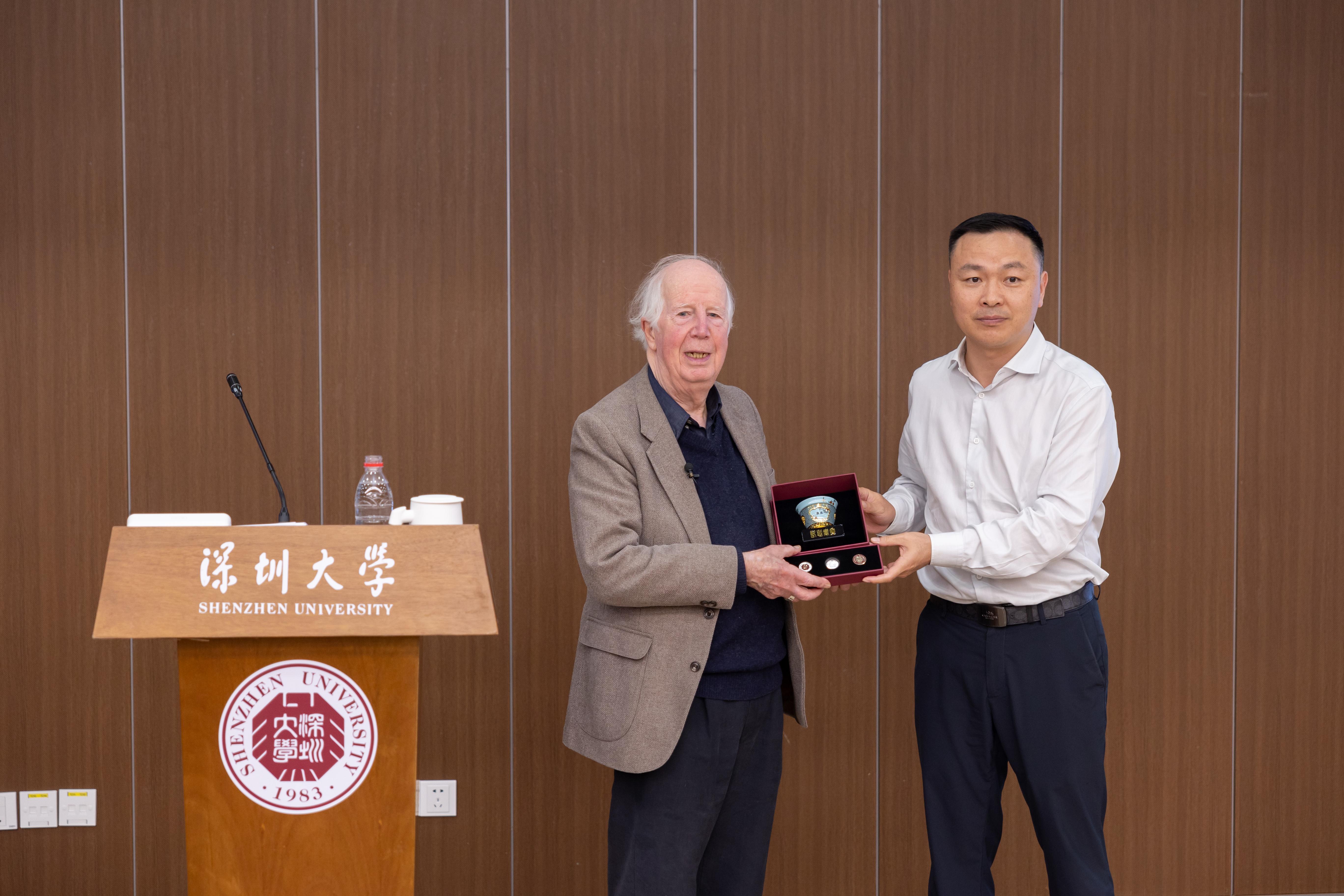 这一次,“萌爷爷”不但来深大讲座,还成为了“深大人”,令深大师生们更加兴奋。当天,深圳大学聘请麦克法兰为名誉教授,深圳大学党委书记李清泉为他颁发了聘书,党委副书记吴报水代表学校与麦克法兰交换纪念品。