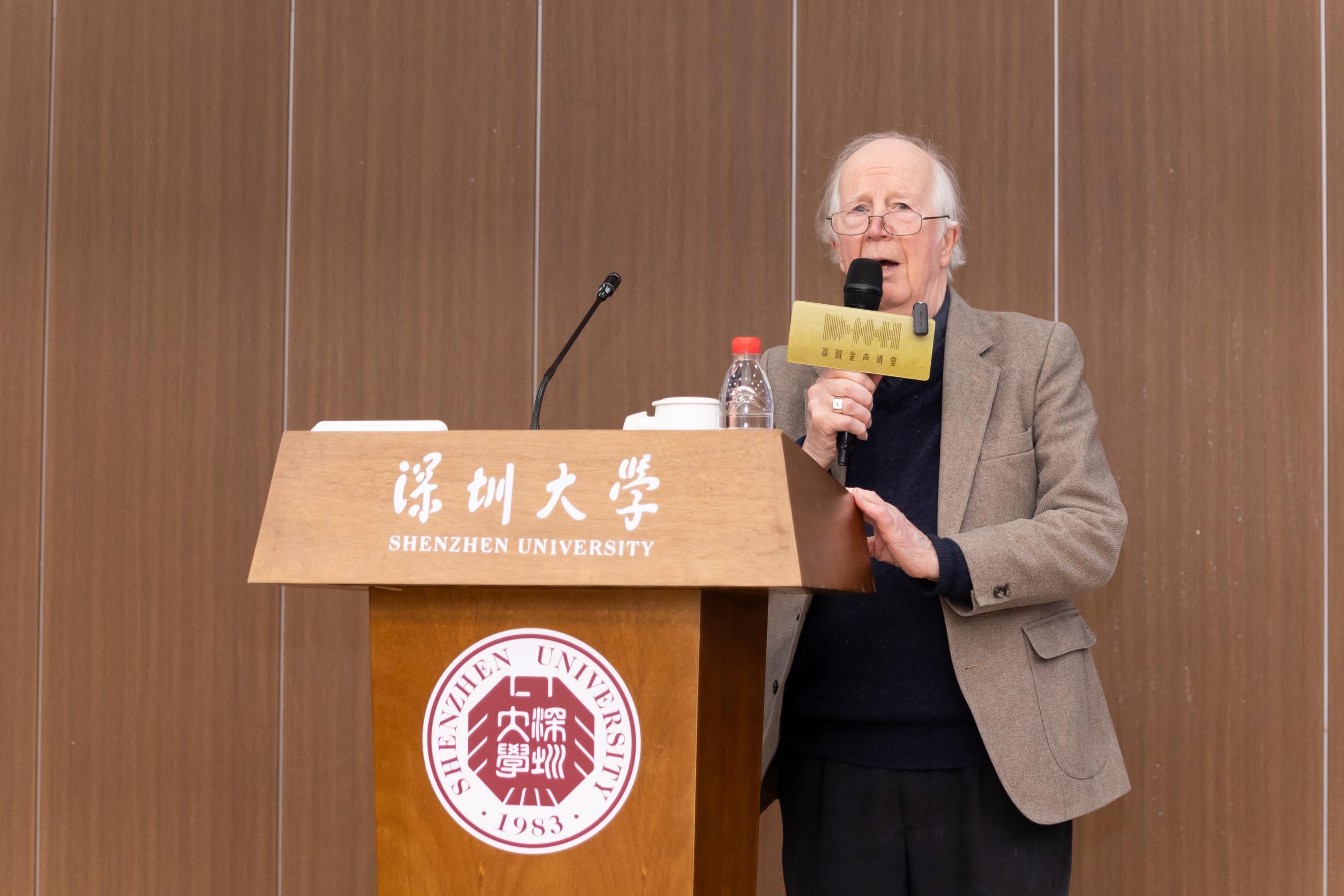 2025年11月4日下午,深圳大学丽湖校区启明楼D101阶梯教室内座无虚席,连过道上都坐满了人,甚至教室后排还站满了没座位的人——师生们早早地来到现场,等待聆听“萌爷爷”艾伦·麦克法兰教授(以下简称麦克法兰)在荔园金声讲堂第12期、鹏城群学讲坛第39期暨创新领航讲座上,讲述“深圳之谜”。