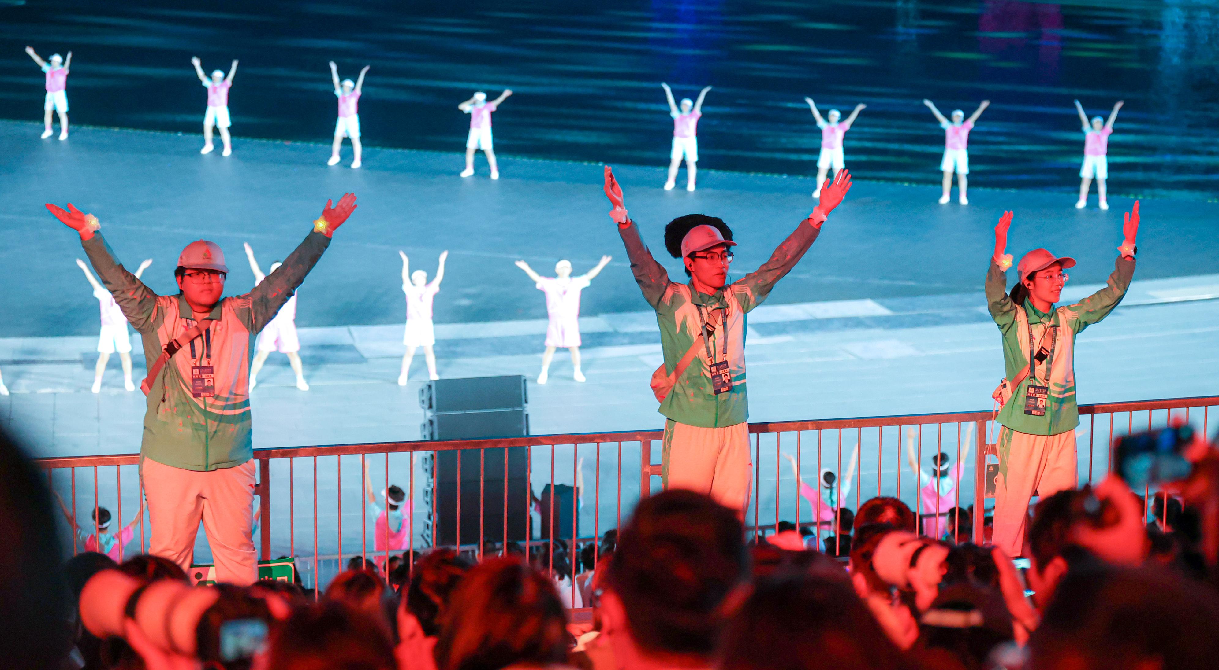 负责内场核心A区的人文学院汉语言文学卓越班2024级的赵紫欣和她的63个小伙伴们可谓“临危受命”——这64名志愿者原本是服务岗,却在最后阶段被额外委以“氛围组”的重任——需要在节目间隙,带领观众互动。没有舞蹈基础?那就从零开始学!他们跟着3名专业舞蹈老师每晚排练至少3小时,硬是啃下了3首歌的配套动作。“那几天,梦里都在比划动作,”赵紫欣笑着说。