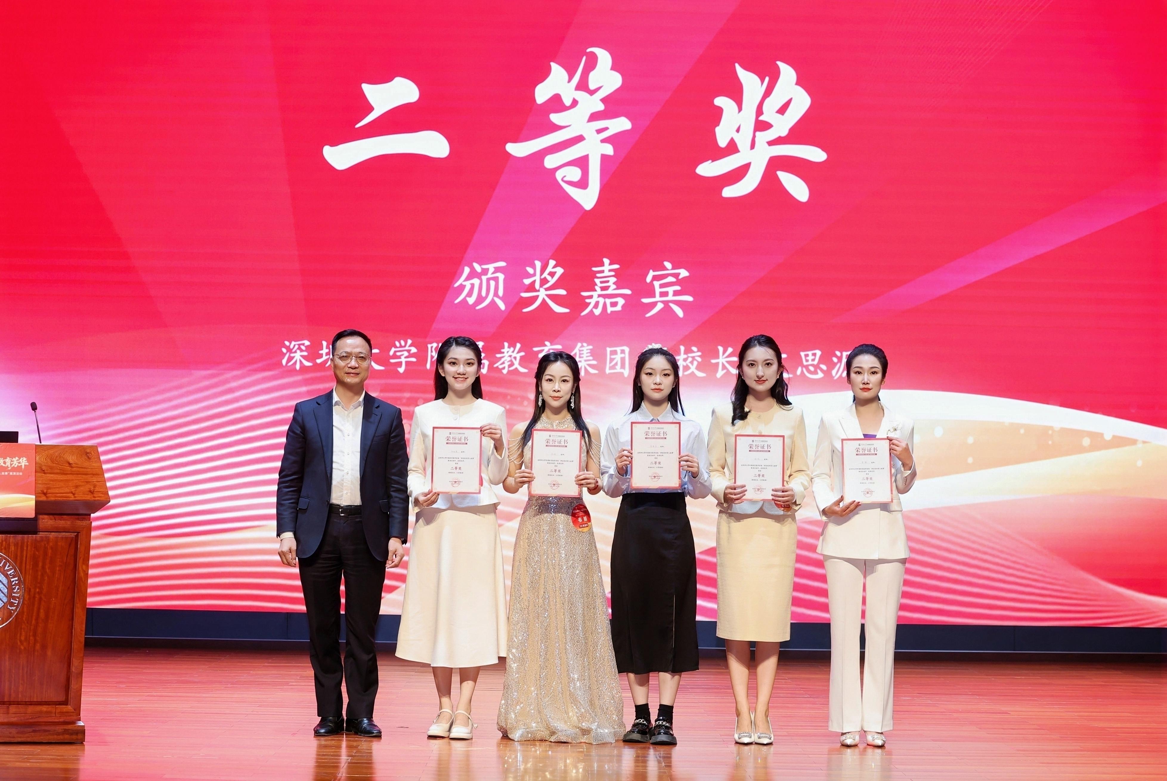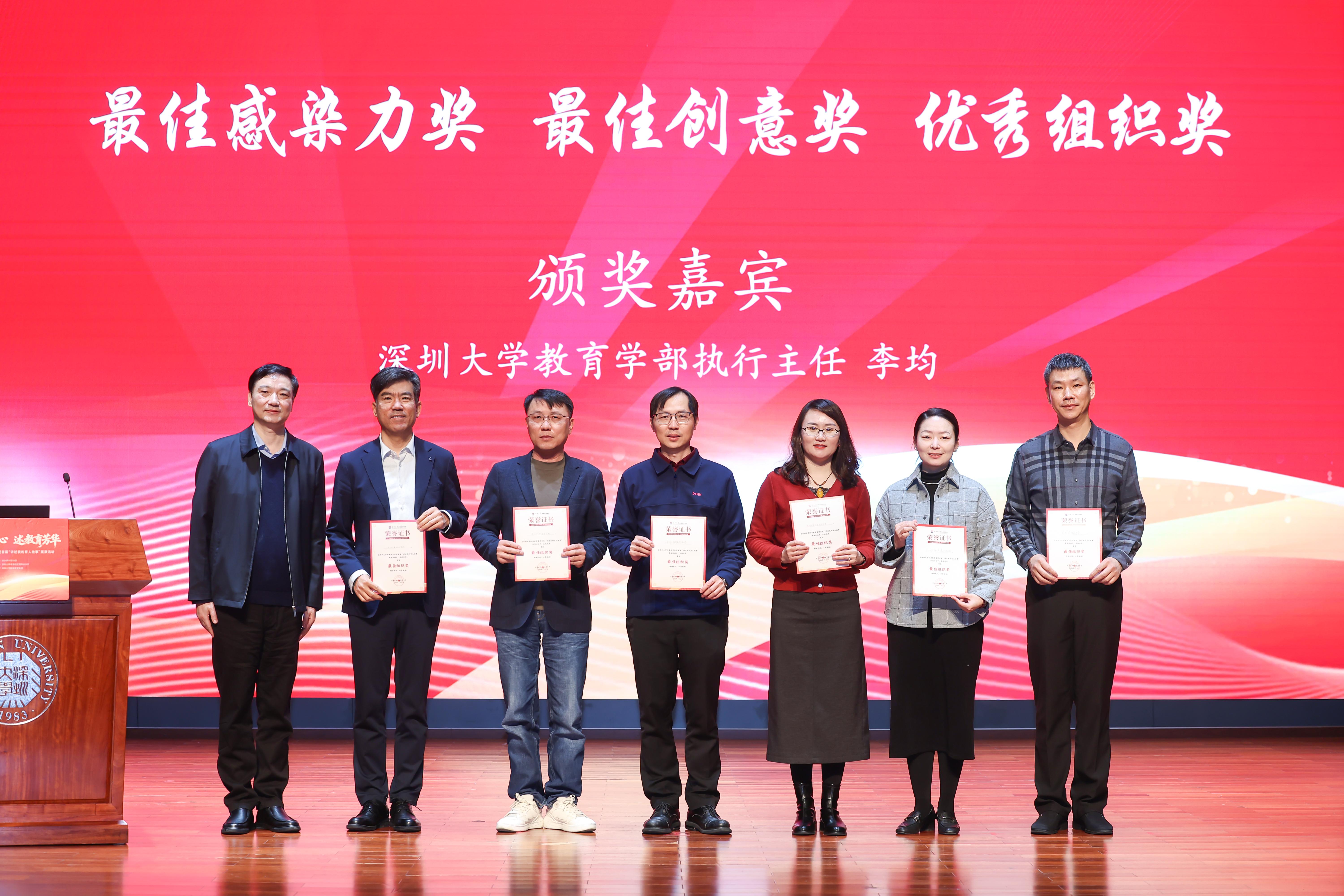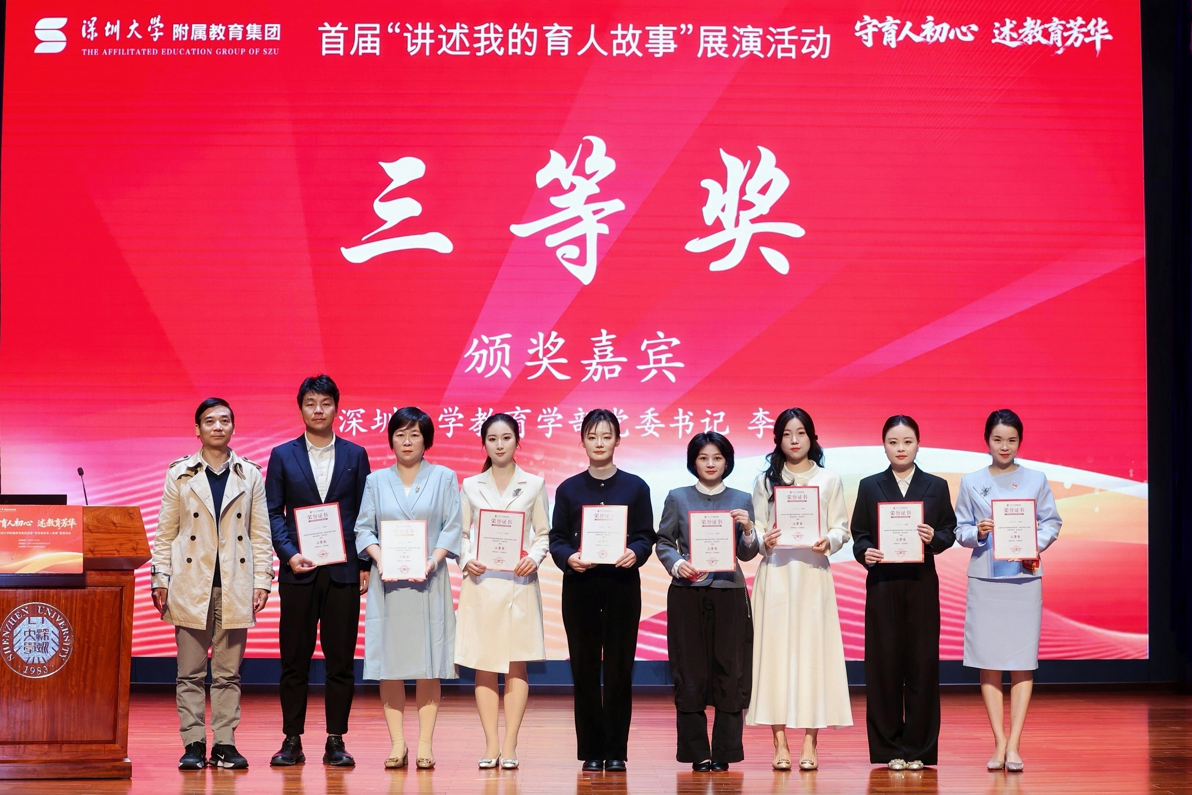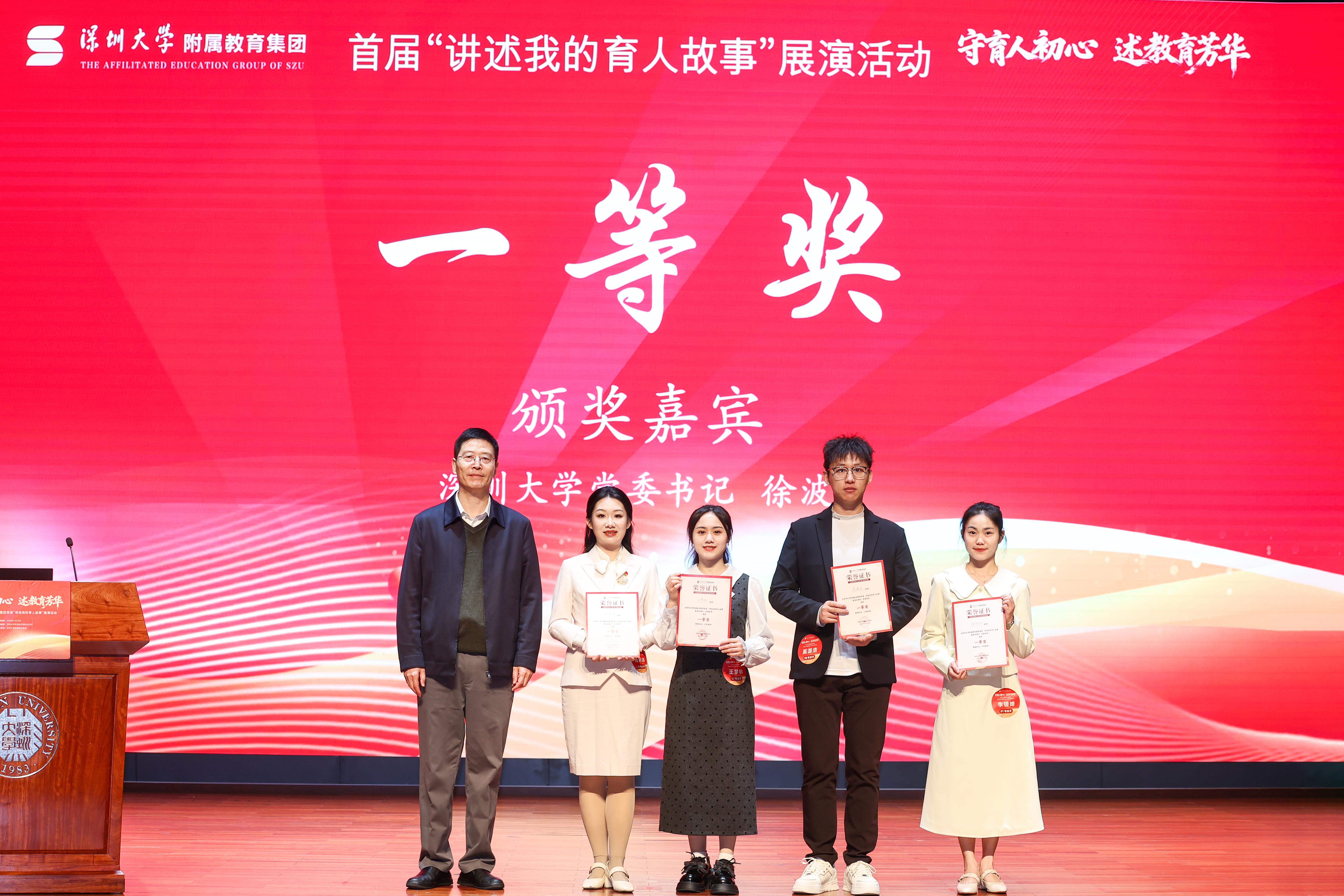 经评审组汇评,此次展演共评选出一等奖4名、二等奖5名、三等奖8名以及最佳感染力奖、最佳创意呈现奖各2名,优秀组织奖6个(单位)。其中,深圳大学附属中学陈妍冰、深圳大学附属南山幼儿园李镘婵、深圳大学附属后海小学奚源浩、深圳大学附属实验中学王梦林获得一等奖;深圳大学附属中学、深圳大学附属后海小学、深圳大学附属南山幼儿园、深圳大学附属实验中学、深圳大学附属坂田学校、深圳大学附属中学宝安学校获得优秀组织奖。徐波,集团总校长文思源,教育学部党委书记李臣、执行主任李均分别为获奖选手和单位颁奖。