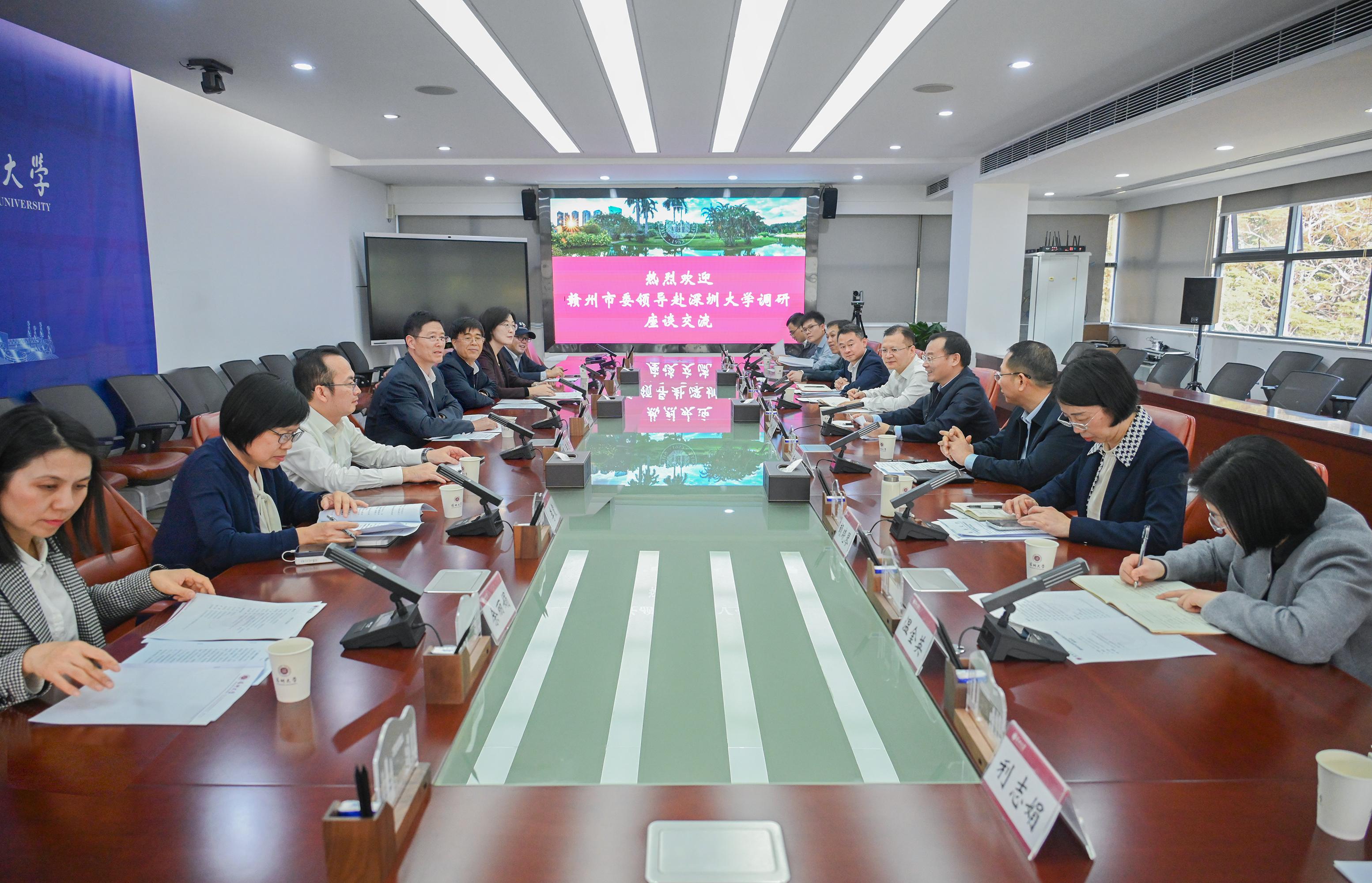 3月6日上午,赣州市委常委、宣传部部长钟小武一行来到深圳大学调研交流,深圳大学党委书记徐波、副校长汪永成会见来宾,双方在粤海校区汇元楼201会议室围绕深化校地合作、推进人才培养与学科建设等议题展开座谈交流。汪永成主持座谈会。