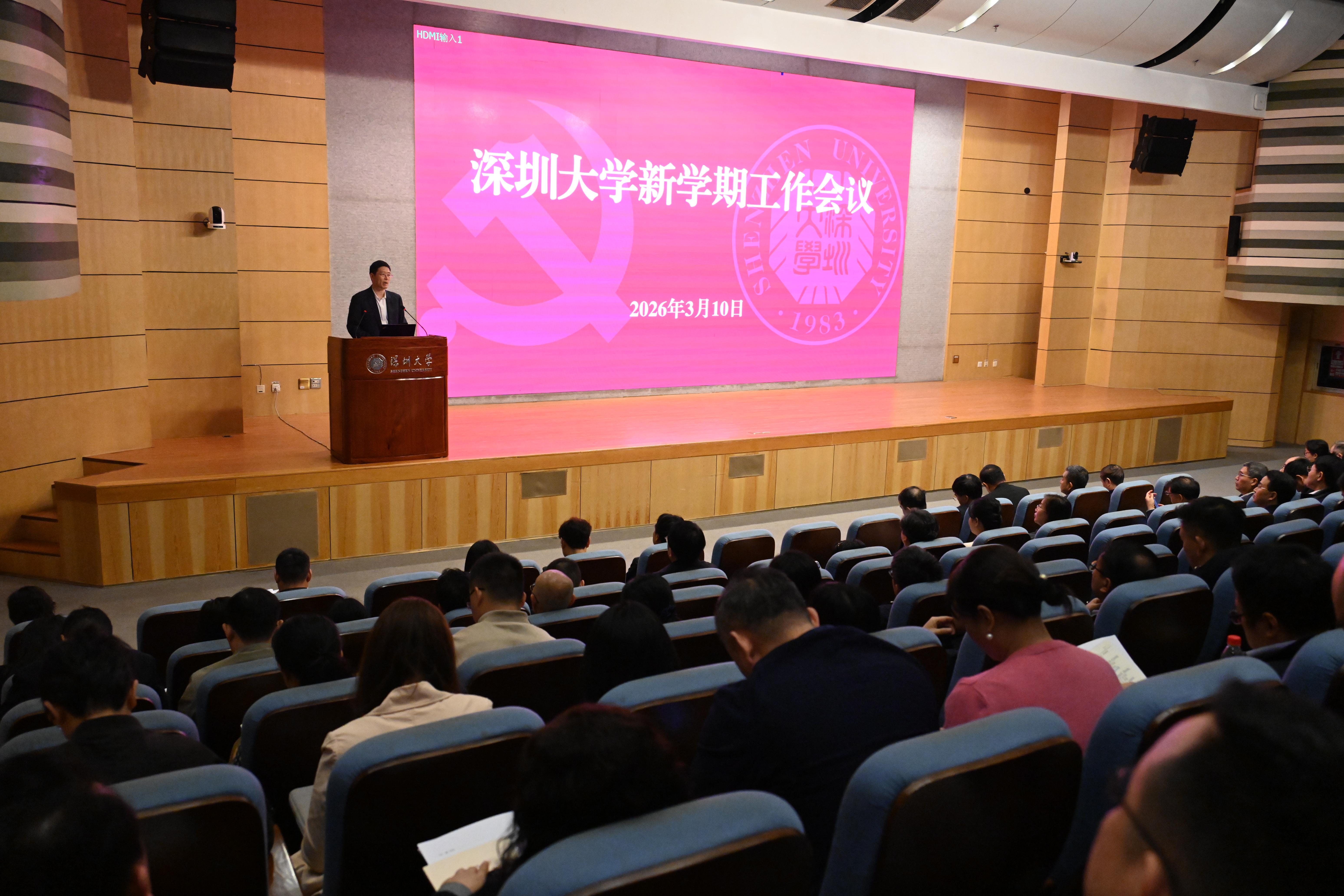 3月10日上午,深圳大学在粤海校区汇星楼1号报告厅召开新学期工作会议,对新学期各项工作进行部署。校党委书记徐波,党委副书记、纪委书记王月兴,副校长李永华、汪永成、周辉出席会议。全体中层干部,全国重点实验室等国家级科研机构负责人,学部下设学院书记、院长,学校学术委员会、人事工作教授委员会和计财工作教授委员会主任、副主任参加会议。王月兴主持会议。