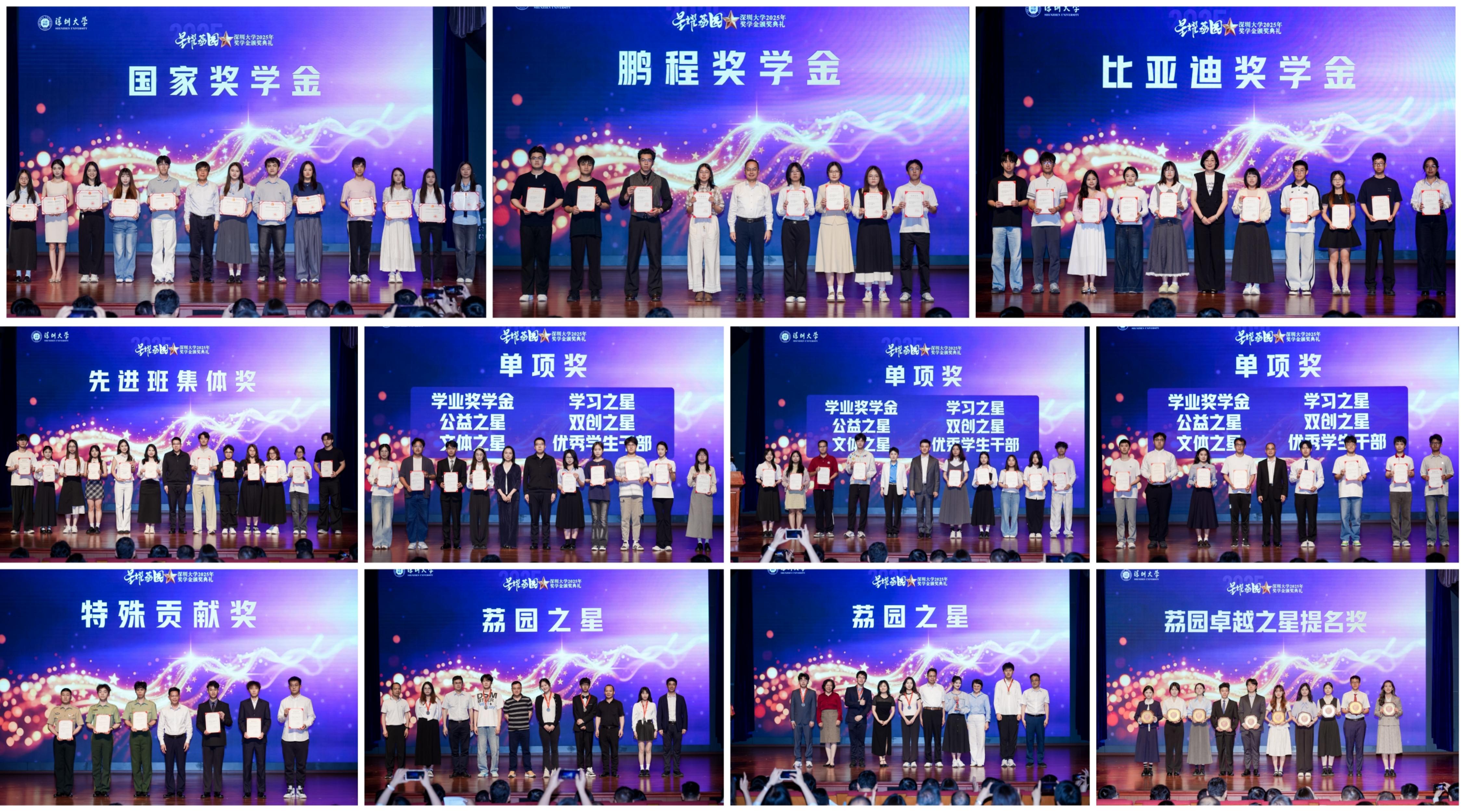 本学年度,深圳大学共有超两万人次学子荣获奖项,累计发放奖学金金额1.67亿元。其中449名同学获得国家奖学金,包括本科生76人、硕士研究生331人、博士研究生42人;8989人次获得“学习之星”“双创之星”“公益之星”“文体之星”“优秀学生干部”“拔尖创新人才奖学金”等单项奖学金;399人次获得“荔园之星”“荔园卓越之星提名奖”“荔园卓越之星”和“荔园优学奖”等综合奖。社会奖学金方面,2025年学校新增设“比亚迪奖学金”,共有34名同学获此奖励;同时,100人获得鹏程奖学金,25人获得“永旺奖学金”。