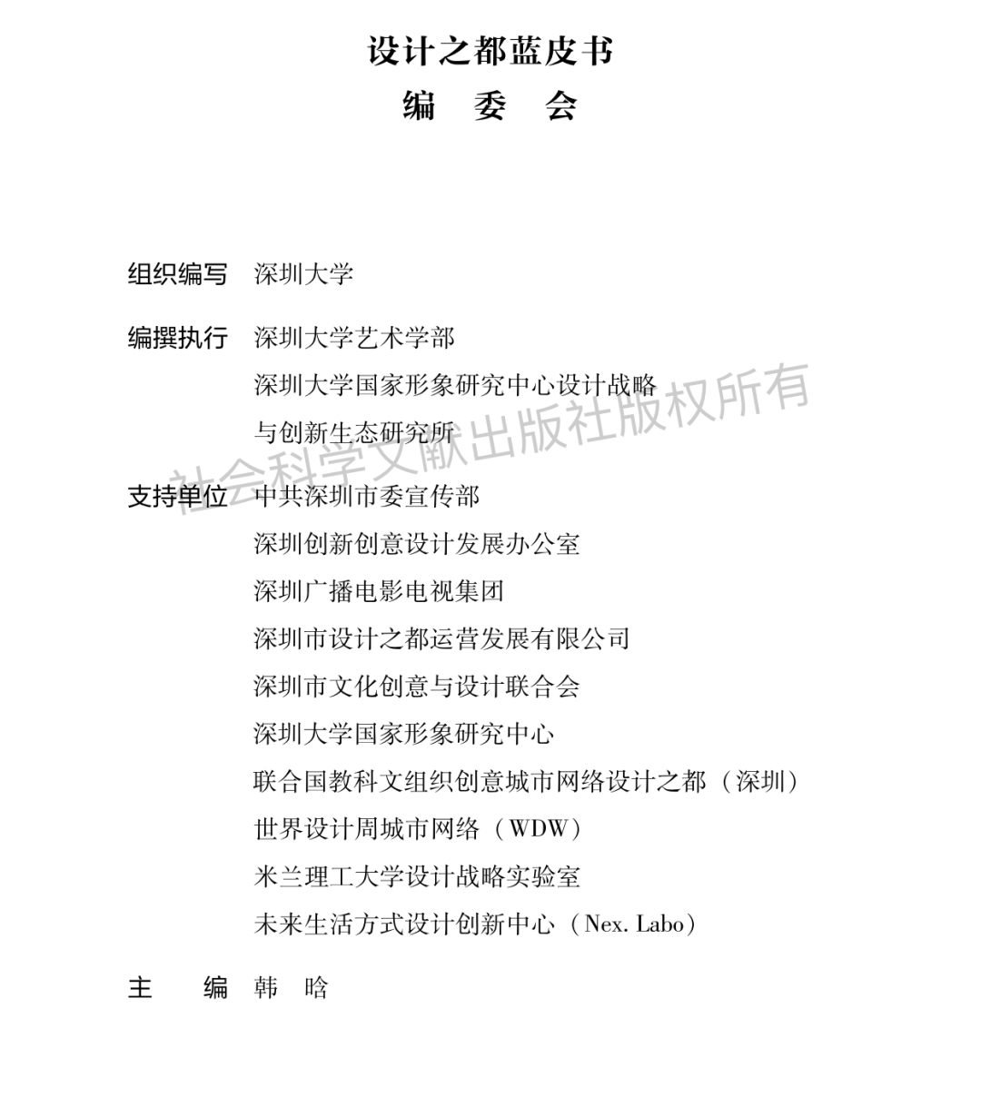 《世界设计之都蓝皮书》(全称为《设计之都蓝皮书——世界设计之都创新发展报告2024-2025》),是中国首个设计之都蓝皮书系列丛书的首部报告。蓝皮书由深圳市委宣传部、深圳创意创新设计发展办公室发起,深圳大学艺术学部设计创新城市国际系列研究团队主持编撰,深圳大学国家形象研究中心设计战略与创新生态研究所组织执行,社会科学文献出版社出版(“中国式现代化研究丛书·智库系列”)旨在与全球专家共同探讨“设计之都”如何肩负新时期的社会使命,为城市及区域可持续发展提供源动力。