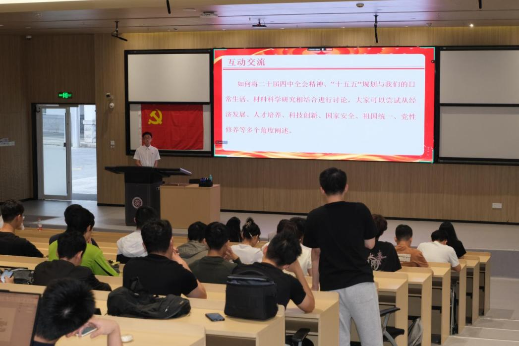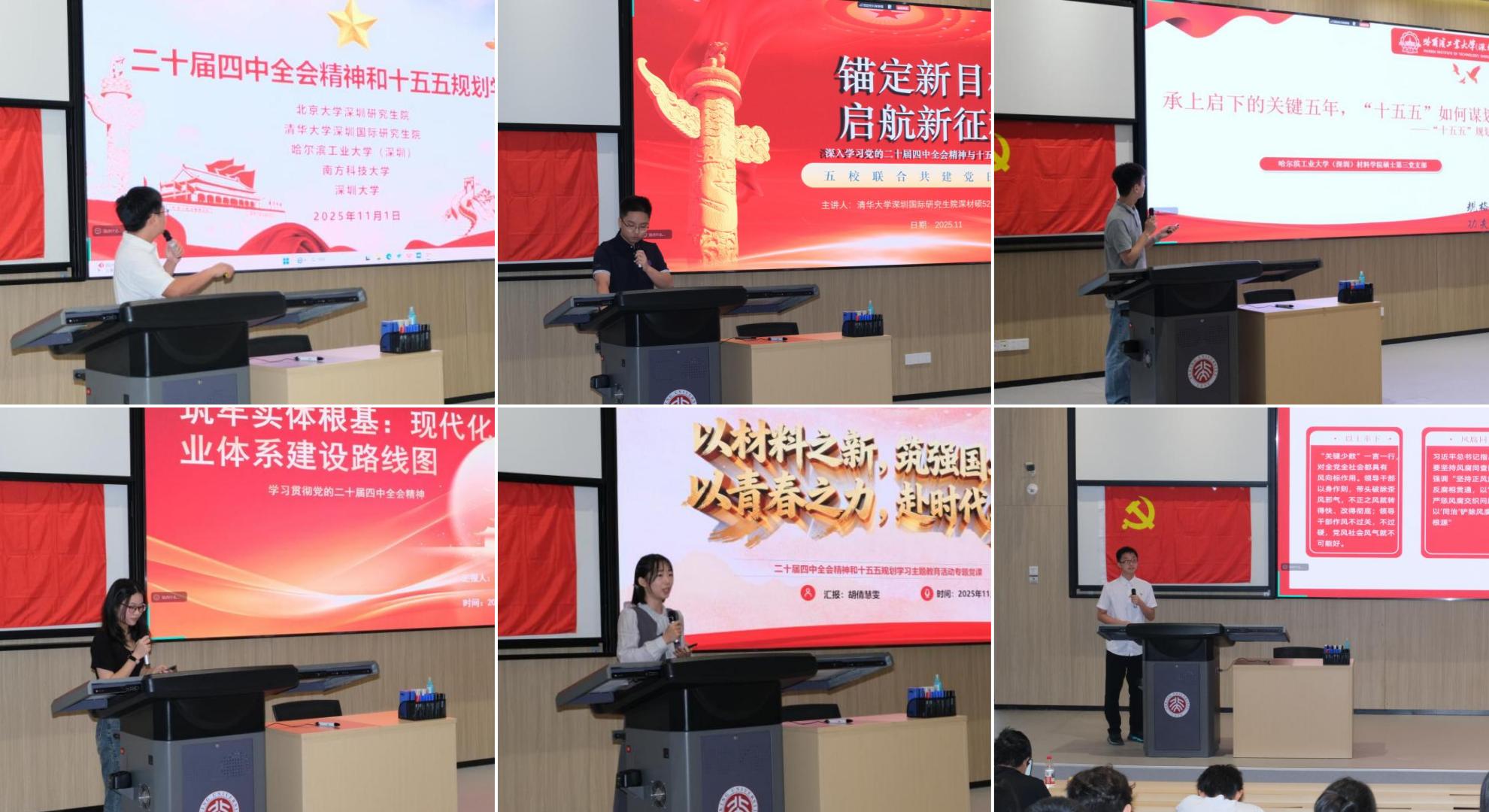 为深入学习领会党的二十届四中全会精神,前瞻把握国家“十五五”规划战略方向,2025年11月1日下午,一场以“党的二十届四中全会精神和‘十五五’规划学习”为主题的大学城五校联合主题党日活动在北京大学深圳研究生院举行。本次活动由深圳大学材料学院研究生第二党支部、北京大学深圳研究生院材料学院硕士党支部、清华大学深圳国际研究生院材硕52党支部、哈尔滨工业大学(深圳)前沿学部材料学院硕士第一党支部、南方科技大学工学院材料系研究生第一党支部等14个材料专业党支部共同发起,通过微党课、专题研讨等形式,深入学习了党的二十届四中全会公报和“十五五”规划建议内容,结合材料学科特色,探讨青年一代在国家现代化建设新征程中的使命与担当。