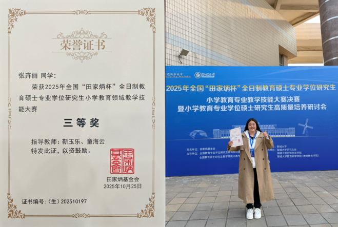 10 月 24 日至 26 日,2025 年全国 “田家炳杯” 全日制教育硕士专业学位研究生小学教育领域教学技能大赛决赛在山东省聊城大学圆满落幕。经过多轮激烈比拼,深圳大学教育学部 2023 级小学教育专业硕士研究生张卉丽凭借出色的教学设计、娴熟的课堂把控与扎实的专业素养,在小学科学赛道脱颖而出,荣获全国三等奖,为学校赢得荣誉,也标志着深圳大学小学教育专业硕士培养质量再获全国认可。