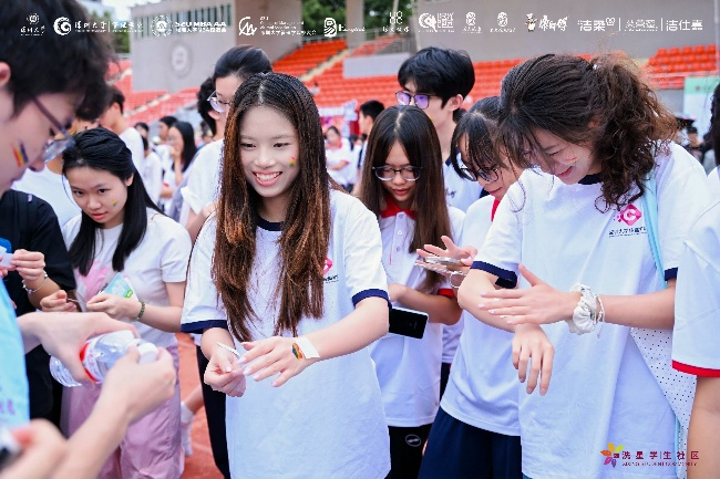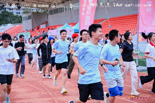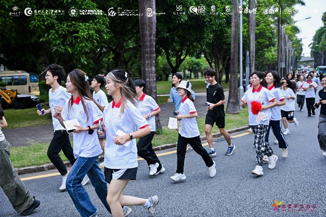 随后,在专业教练的带领下,师生们完成热身运动。下午16时35分,开学季开学跑出发指令响起,“阳光圳能量”新生长跑激励计划3.0暨穿越鲲鹏径启动仪式现场,奔跑的队伍如潮水般向前涌动。沿途设置的红、黄、蓝、绿四色彩色奔跑道具补给站成为校园里最亮丽的风景线,志愿者们热情地为参与者递上彩色爆炸头饰与奖券,一句句“加油”的呐喊让奔跑的路途充满温暖。无论是步履矫健的运动达人,还是放慢脚步欣赏校园风光的新生,都在奔跑中找到了属于自己的快乐,充分诠释了“阳光身心”的体育精神。