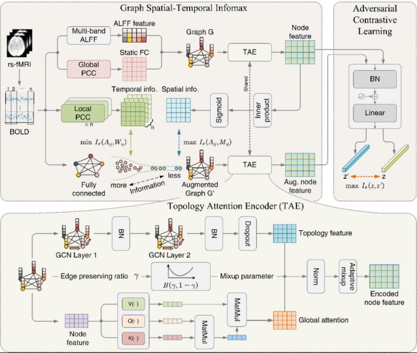 近日,深圳大学医学部生物医学工程学院助理教授张力在国际知名学术期刊Medical Image Analysis(中科院一区TOP,影响因子11.8)发表了最新研究成果,论文题目为 “GraSTI-ACL: Graph Spatial-Temporal Infomax with Adversarial Contrastive Learning for Brain Disorders Diagnosis Based on Resting-State fMRI”。深圳大学2023级研究生何彪为论文独立第一作者,张力为独立通讯作者,深圳大学为第一作者单位及通讯作者单位。