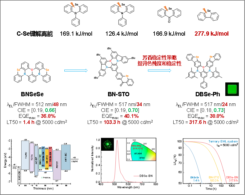 成果五:提出协同“重原子+芳香性”策略提升MR-TADF材料的光电性能。团队在之前的研究中提出利用“重原子效应”提升MR-TADF材料光电性能的策略,取得了原创性的研究成果(Chem. Eng. J.2021,426, 131129.被引用197次,被评为ESI高被引论文;Nat. Photon.2022,16, 803.被引用427次,被评为ESI高被引论文,热点论文)。但是,由于重原子硫和硒较大的原子半径,所设计的分子发射光谱明显展宽,难以获得高色纯度与稳定性良好的材料。在该工作中,团队将硒原子嵌入芳香性五元环,既利用了硒的重原子效应提升发光分子的kRISC,又通过芳香性稳定化作用提升了化合物的稳定性。基于材料DBSe-Ph制备的OLED器件,成功实现了高达38.8%的EQE,光谱半峰宽仅为24nm,对应的CIEy值达到0.73,以及优异的器件寿命,突破了含硒MR-TADF材料在色纯度与稳定性上的瓶颈。论文信息:J. Liu, J. Miao, J. Dong, Z. Chen,Z. Huang*, C. Yang*, Increasing aromaticity in selenium-embedded hetero ring enables stable narrowband multi-resonance TADF emitter for long-lifetime pure-green OLEDs,Adv. Mater.2025,e13987.(IF:26.8)