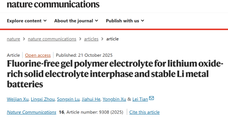 近日,深圳大学化学与环境工程学院田雷副教授课题组在Nature Communications期刊上发表题为“Fluorine-free gel polymer electrolyte for lithium oxide-rich solid electrolyte interphase and stable Li metal batteries”的研究论文。团队成员22级硕士研究生许伟健为论文第一作者,田雷副教授为论文独立通讯作者,深圳大学为第一作者单位及通讯单位。