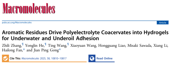 近日,化学与环境工程学院特聘副教授范海龙在水下黏附材料领域取得重要进展:他们受自然界相分离体系中的固有无序蛋白氨基酸序列启发,研发出一种无需外部刺激即可自发实现相分离与相转变的凝聚层(coacervate)体系,该材料不仅在水下展现出卓越的黏附性能,还能在油环境中稳定工作,相关成果发表于Macromolecules。范海龙、北海道大学教授龚剑萍为共同通讯作者,深圳大学化学与环境工程学院为第一完成单位。
