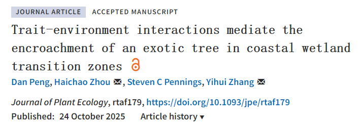 2025年11月,深圳大学生命与海洋科学学院滨海红树林湿地课题组在Journal of Plant Ecology(中科院大类和小类生态学一区,TOP期刊),发表题为“Trait-environment interactions mediate the encroachment of an exotic tree in coastal wetland transition zones”的研究论文,揭示了外来红树植物无瓣海桑(Sonneratia apetala)在滨海湿地交错带中快速扩张的机制,为红树林保护与科学管理提供了理论支持与政策建议。