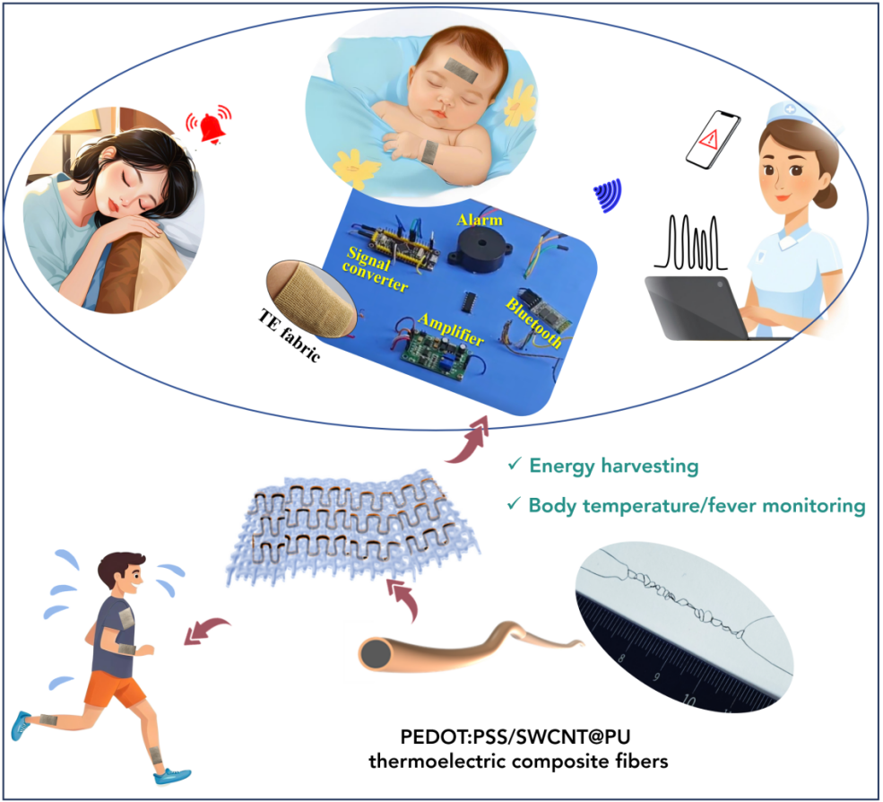 热电材料能够实现热能与电能之间的相互直接转换。课题组近3年来在热电材料的智慧建筑、可穿戴电子、人工智能、和火灾预警等应用场景方面开展了系列研究。传统体温测量工具,如额温枪和电子体温计,往往只能实现瞬时测量,无法连续追踪体温变化,且佩戴不便,难以应用于儿童、高龄人群或需要长期监护的患者。此外,这类设备通常依赖电池供电,不利于日常持续监测。而人体每天都会散发大量热量,如果能够将这种微弱温差转化为电信号,就可以实现真正的“自供能”智能体温监测。热电材料恰好具备这种“以温差发电”的能力。然而,要将热电材料真正变成能穿、能洗、能动的智能织物,仍面临诸多困难,包括纤维强度不足、热电性能不稳定、对汗水和低温敏感等问题。
