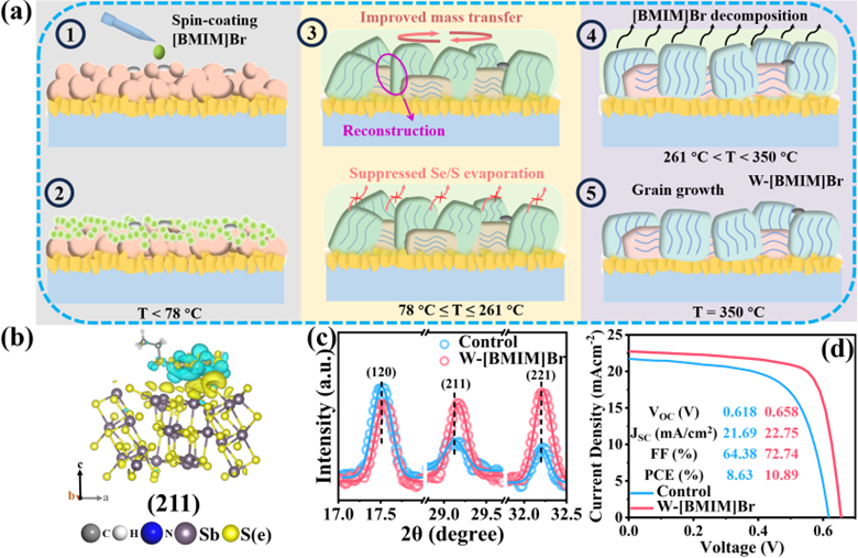 [BMIM]Br离子液体辅助薄膜晶化示意图(a);[BMIM]Br离子液体吸附Sb2(S,Se)3的(211)晶面差分电荷密度图(b);对照样品和[BMIM]Br离子液体处理薄膜的放大XRD图(c);对照样品和[BMIM]Br离子液体处理器件的电流密度与电压特性曲线(d)。