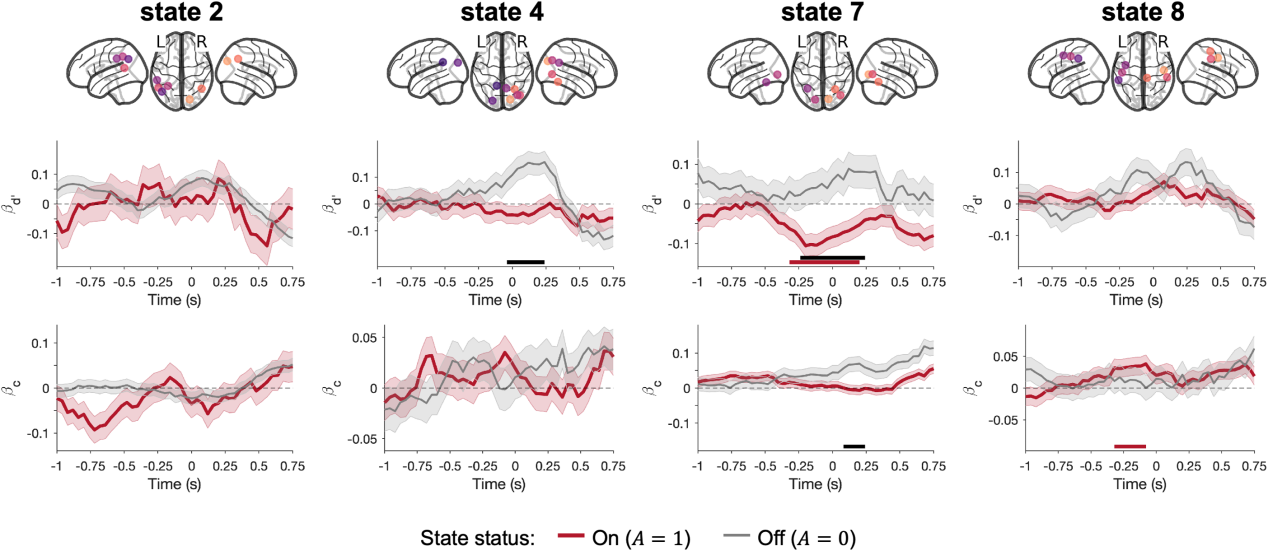 一是视觉Alpha网络调控知觉灵敏度 (d')。脑磁图数据显示,在视觉刺激出现前,视觉Alpha网络 (visual alpha network) 的活动越强,人对视觉刺激的感知准确性越差。