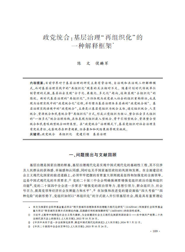 文章来源:陈文,侯麟军.政党统合:基层治理“再组织化”的一种解释框架[J].政治学研究,2025,(06):109-120+216-217.