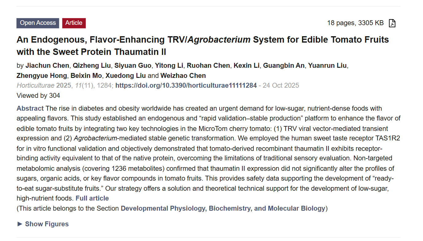 在全球糖尿病与肥胖症发病率不断攀升的背景下,开发兼具低糖、营养与良好风味的健康食品成为当前科研与产业界的重要方向。近日,深圳大学iGEM团队本科生在农林与园艺领域国际期刊Horticulturae(JCR Q1,中科院农林科学2区,IF 3.0)上发表题为“An Endogenous, Flavor-Enhancing TRV/Agrobacterium System for Edible Tomato Fruits with the Sweet Protein Thaumatin II” 的研究论文,为这一领域带来创新突破。